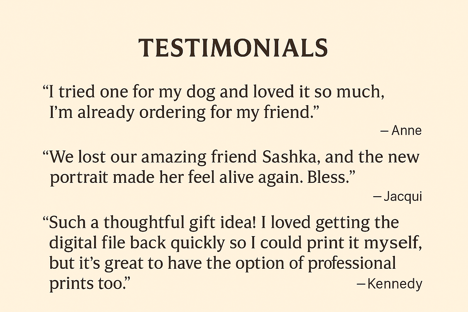 Shop nowOur portraits are more than art — they’re lasting tributes to the pets who shaped our lives. A way to honor their memory and keep their spirit alive, forever by your side.